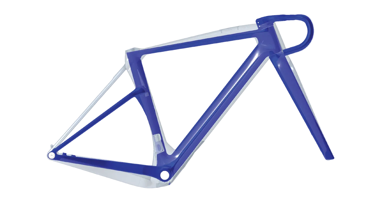 Frame mass is reduced by aligning carbon layup with measured load paths and increasing structural efficiency through tube geometry. Material is applied only where stress levels require it and removed everywhere else.