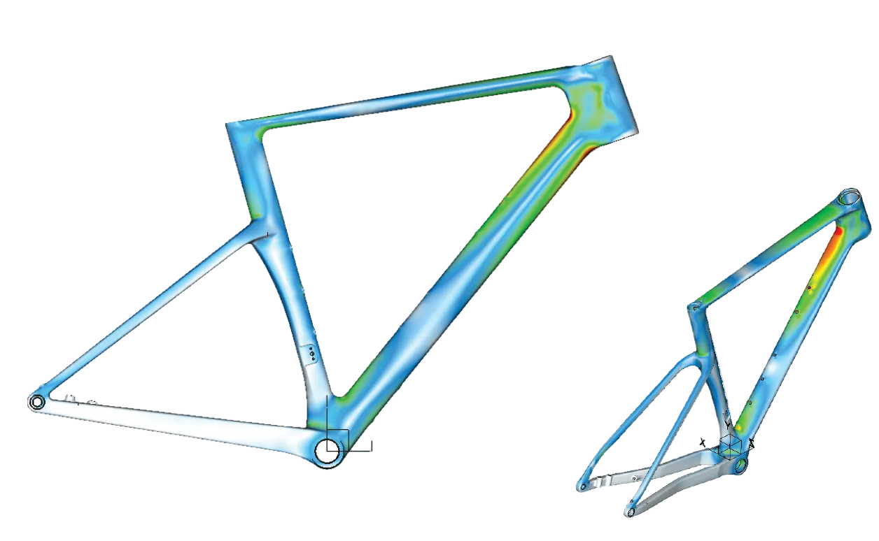 Advanced Finite Element Analysis (FEA) was applied throughout development to precisely identify high‑stress and low‑stress zones across the frame. This allowed reinforcement only where structural loads demand it, while reducing carbon material in areas that do not require additional strength.